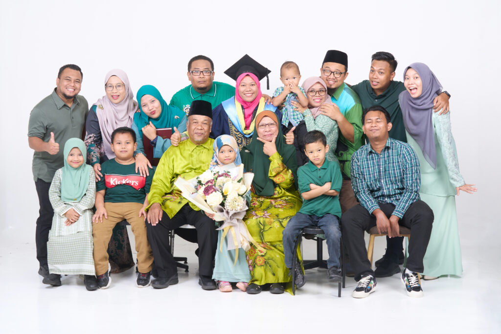 Dalam 90% situasi untuk keluarga Melayu, kami akan susun setiap ahli keluarga dengan mengambil kira kedudukan antara mahram. Ahli keluarga yang lebih rendah juga boleh ditinggikan menggunakan stool pijak kaki supaya susunan nampak lebih seimbang dan kemas.